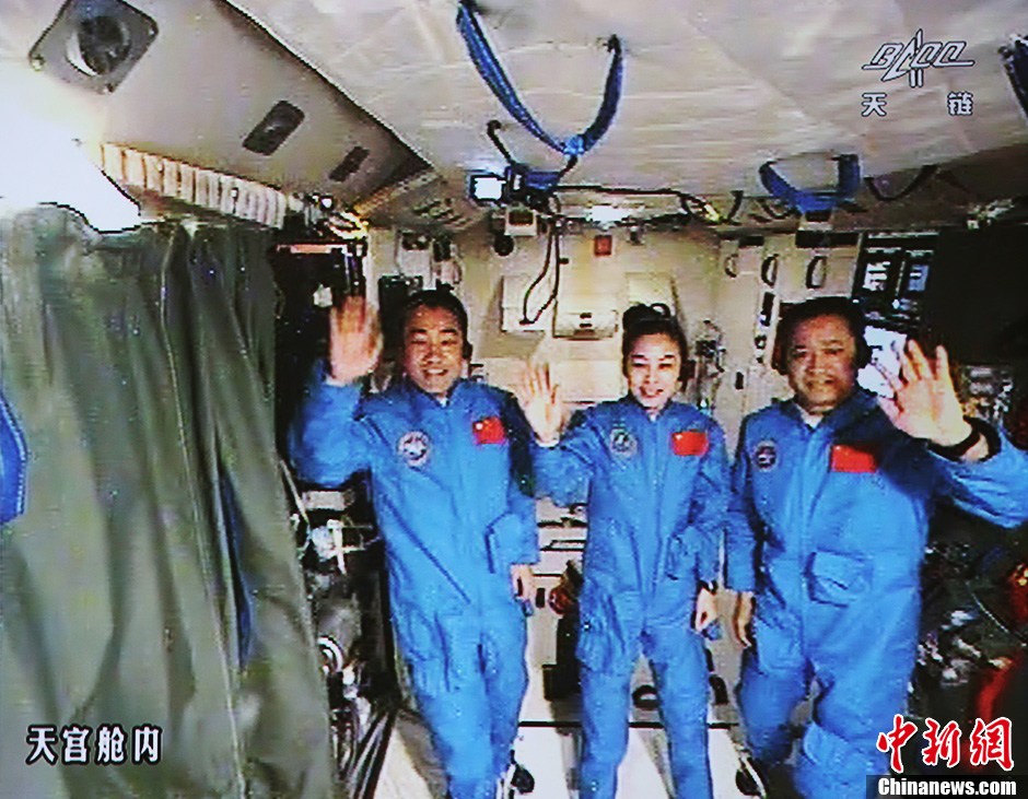 6月20日10時許,神舟十號航天員在天宮一號開展基礎(chǔ)物理實驗,為青少年進(jìn)行中國首次太空授課。圖為神舟十號航天員授課前與大家招手致意。中新社發(fā) 秦憲安 攝
