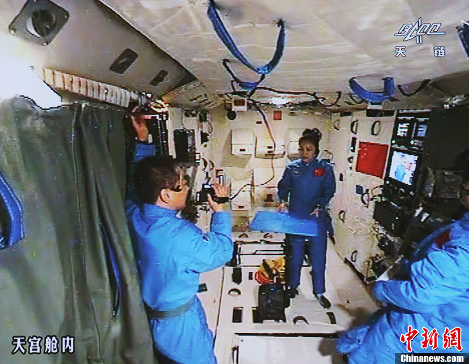6月20日10時許,神舟十號航天員在天宮一號開展基礎(chǔ)物理實驗,為青少年進行中國首次太空授課。圖為實時畫面。中新社發(fā) 秦憲安 攝