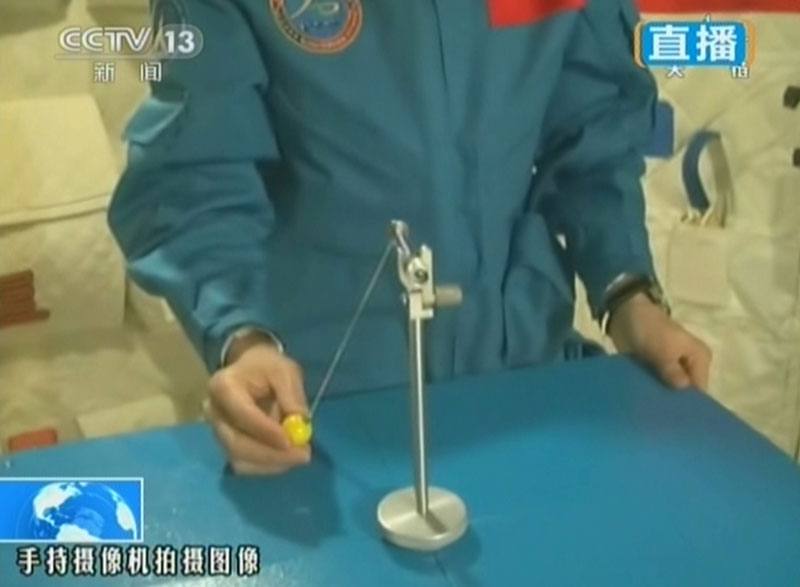 6月20日上午10時(shí)許,神舟十號(hào)航天員進(jìn)行中國(guó)首次太空授課,女航天員王亞平擔(dān)任主講,成為中國(guó)首位“太空教師”。圖為王亞平做“小球?qū)嶒?yàn)”。(視頻截圖)
