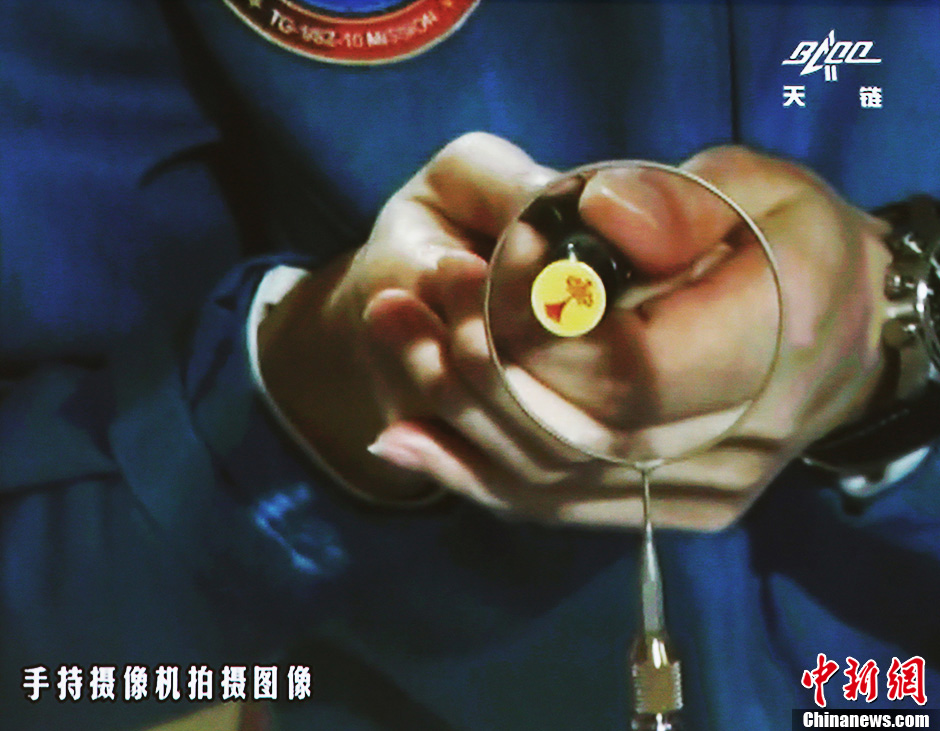 6月20日10時(shí)許,神舟十號(hào)航天員在天宮一號(hào)開展基礎(chǔ)物理實(shí)驗(yàn),為青少年進(jìn)行中國首次太空授課。圖為王亞平講授太空失重提供條件下,在水膜上粘貼中國結(jié)演示。中新社發(fā) 秦憲安 攝