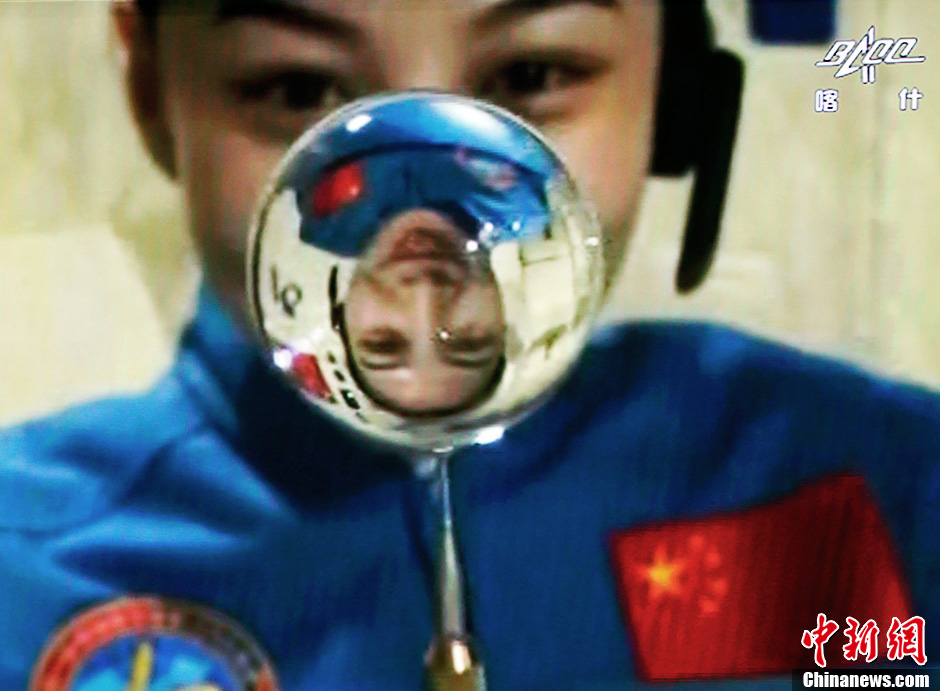6月20日10時許,神舟十號航天員在天宮一號開展基礎(chǔ)物理實驗,為青少年進(jìn)行中國首次太空授課。圖為王亞平講授太空失重提供條件下的水球演示。中新社發(fā) 秦憲安 攝