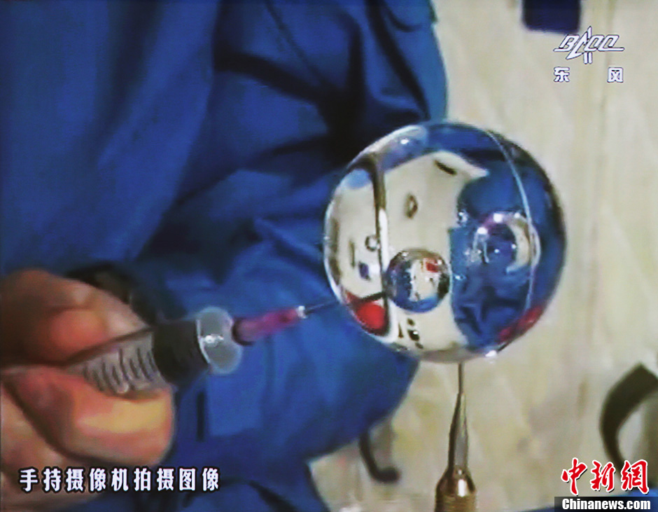 6月20日10時(shí)許,神舟十號(hào)航天員在天宮一號(hào)開(kāi)展基礎(chǔ)物理實(shí)驗(yàn),為青少年進(jìn)行中國(guó)首次太空授課。圖為王亞平講授太空失重提供條件下的水球演示。中新社發(fā) 秦憲安 攝