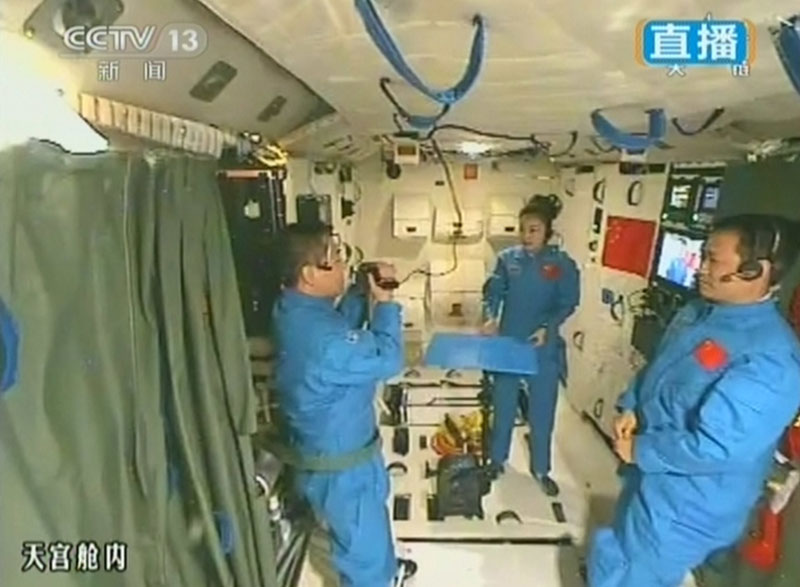 6月20日上午10時許,神舟十號航天員進行中國首次太空授課,女航天員王亞平擔任主講,成為中國首位“太空教師”。(視頻截圖)