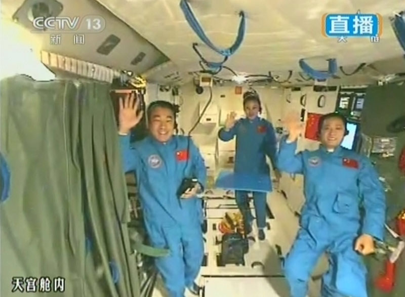 6月20日上午10時許,神舟十號航天員進行中國首次太空授課,女航天員王亞平擔任主講,成為中國首位“太空教師”。(視頻截圖)