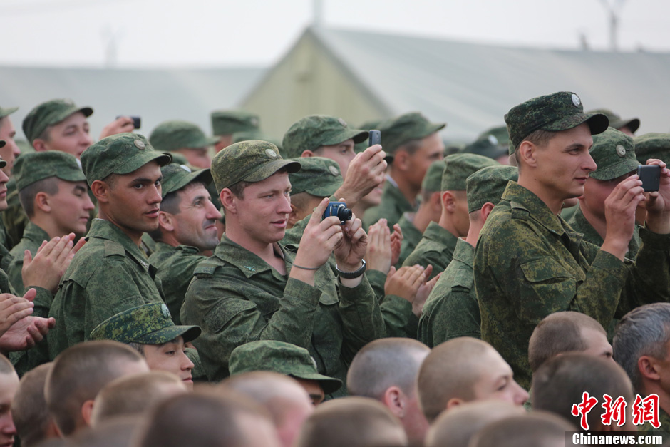 8月10日,隨同中方參演部隊(duì)赴俄羅斯參加“和平使命-2013”中俄聯(lián)演的沈陽軍區(qū)政治部文工團(tuán)演員們,為中俄千余名參演官兵獻(xiàn)上了一場(chǎng)精彩的文藝晚會(huì)。豐富多彩的文藝節(jié)目,將位于切巴爾庫爾訓(xùn)練場(chǎng)的中俄聯(lián)演野營(yíng)村,變成了友誼的盛會(huì)、歡樂的海洋。 圖為精彩節(jié)目吸引俄國(guó)官兵。中新社發(fā) 李祥輝 攝
