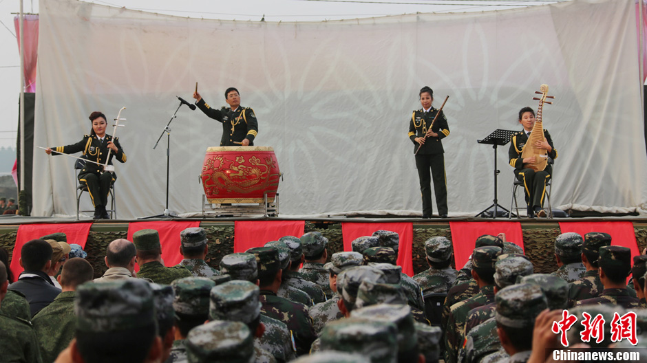 8月10日,隨同中方參演部隊赴俄羅斯參加“和平使命-2013”中俄聯(lián)演的沈陽軍區(qū)政治部文工團(tuán)演員們,為中俄千余名參演官兵獻(xiàn)上了一場精彩的文藝晚會。豐富多彩的文藝節(jié)目,將位于切巴爾庫爾訓(xùn)練場的中俄聯(lián)演野營村,變成了友誼的盛會、歡樂的海洋。圖為民樂合奏《出征》。中新社發(fā) 李祥輝 攝