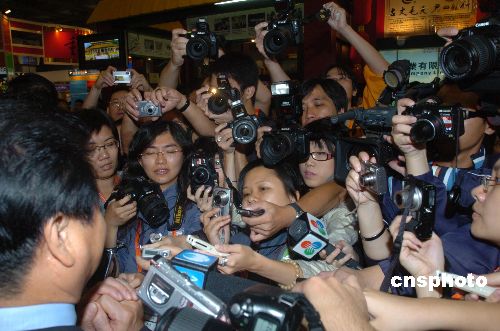 十月十八日,眾多媒體記者在威尼斯人會(huì)展中心舉行的第十二屆澳門(mén)國(guó)際貿(mào)易投資展覽會(huì)(MIF)上,爭(zhēng)搶采訪某省的負(fù)責(zé)人。規(guī)模宏大,盛況空前的第十二屆澳門(mén)國(guó)際貿(mào)易投資展覽會(huì)(MIF),以努力打造成國(guó)際貿(mào)易平臺(tái)為己任,引起了新聞媒體的極大關(guān)注。中新社發(fā) 史利 攝