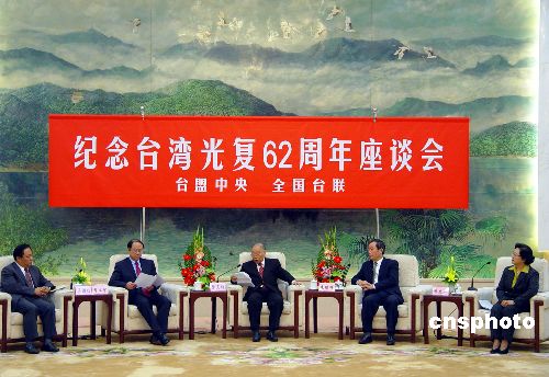 十月二十五日,居住在北京的臺(tái)胞、臺(tái)商和臺(tái)灣學(xué)生與各界人士在人民大會(huì)堂臺(tái)灣廳出席一場(chǎng)座談,回憶臺(tái)灣民眾抗擊外敵的歷史,紀(jì)念臺(tái)灣光復(fù)六十二周年。全國(guó)政協(xié)副主席、臺(tái)盟中央名譽(yù)會(huì)長(zhǎng)張克輝(中)二十五日發(fā)表一篇題為《讓歷史見證未來》的講話。中共中央統(tǒng)戰(zhàn)部常務(wù)副部長(zhǎng)朱維群(右二)、國(guó)務(wù)院臺(tái)灣事務(wù)辦公室常務(wù)副主任鄭立中(左二)等出席活動(dòng)。中新社發(fā) 劉舒凌 攝