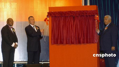 十一月九日晚,安哥拉共和國駐澳門總領事館開幕典禮暨安哥拉獨立三十二周年慶祝酒會在澳門漁人碼頭舉行,澳門特首何厚鏵與安哥拉共和國外交部秘書長Manuel Gomes dos Santos為安哥拉共和國駐澳門總領事館揭幕。 中新社發(fā) 史利 攝