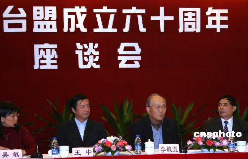 十一月十日,近百位上海老中青三代臺胞、臺盟盟員聚會座談,紀(jì)念臺灣民主自治同盟成立六十周年。當(dāng)日,臺盟上海市委還舉行了“電影劇本《啊,謝雪紅》讀書演講會”,緬懷臺盟首任主席、臺灣知名人士謝雪紅女士。一九四七年十一月十二日,臺盟在香港成立,是當(dāng)代中國八個民主黨派之一。圖為臺盟中央副主席李敏寬(右二)在座談時表示,臺盟走過了六十年愛國的革命的光榮道路,始終與中國共產(chǎn)黨風(fēng)雨同舟、長期合作。中新社發(fā) 許曉青 攝