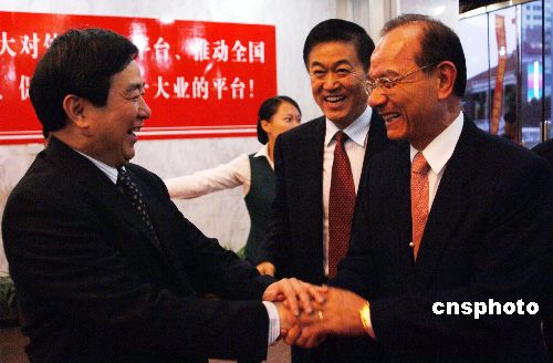 十一月十七日,福建省委常委、常務(wù)副省長張昌平(中)、漳州市市長李建國(左)在漳州與中國國民黨副主席林豐正(右)交談甚歡。第九屆海峽兩岸花卉博覽會(huì)將于十八日在福建漳州隆重開幕,屆時(shí),島內(nèi)外五百多名臺(tái)商將出席盛會(huì)。中新社發(fā) 王東明 攝
