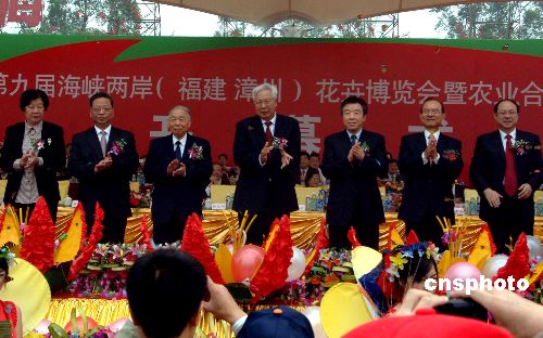 十一月十八日上午,第九屆海峽兩岸(福建漳州)花卉博覽會(huì)暨農(nóng)業(yè)合作洽談會(huì)在福建漳州花博園開幕。圖為全國政協(xié)副主席羅豪才(中)、張克輝(左三),中共福建省委書記盧展工(右三)、省長黃小晶(左二),中國國民黨副主席林豐正(右二)等兩岸嘉賓出席開幕式。中新社發(fā) 王東明 攝