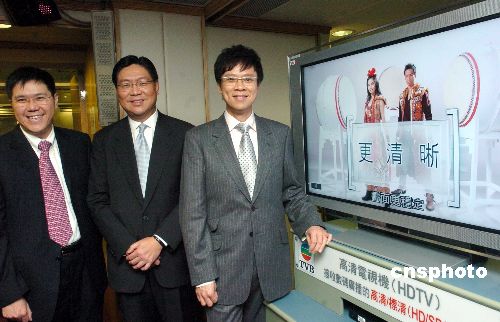 11月26日,香港就推出“數(shù)碼地面電視廣播”舉行記者會(huì),商務(wù)及經(jīng)濟(jì)發(fā)展局局長(zhǎng)馬時(shí)亨,與電視廣播有限公司的高層陳志云(右)和鄭善強(qiáng)(左)在記者會(huì)現(xiàn)場(chǎng),參觀香港電視廣播有限公司(TVB)的高清數(shù)碼電視廣播的片段。中新社發(fā) 鄧慶樂(lè) 攝