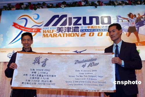 11月30日,香港資深長跑好手李嘉綸(左)代表參賽跑手,從香港田徑總會長跑部主委王劍麟手中接過參賽戰(zhàn)書。香港業(yè)余田徑總會當日宣布,一年一度的香港半馬拉松錦標賽將于2008年1月6日舉行。中新社發(fā) 蔡蔓莉 攝