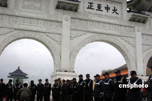 十二月五日,臺北“中正紀念堂”牌樓“大中至正”四字將拆除引發(fā)的風(fēng)波升級,現(xiàn)場爆發(fā)數(shù)波零星沖突。圖為臺灣當(dāng)局調(diào)來上百名警察嚴陣以待。中新社發(fā) 董會峰 攝