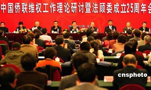 12月8日至9日,中國僑聯(lián)維權(quán)工作理論研討暨紀(jì)念法顧委成立25周年會(huì)議在北京召開,會(huì)議表彰了近五年來各地僑聯(lián)維權(quán)工作先進(jìn)單位和個(gè)人。會(huì)議就建立維權(quán)長效機(jī)制,切實(shí)維護(hù)歸僑僑眷和海外僑胞在國內(nèi)的合法權(quán)利和利益進(jìn)行理論研討。中國僑聯(lián)法顧委是1982年5月6日成立的中國僑聯(lián)高層法律服務(wù)顧問機(jī)構(gòu)。中新社發(fā) 張勤 攝