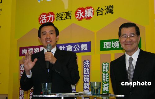 十二月十九日,國(guó)民黨二00八參選人馬英九及其搭檔蕭萬(wàn)長(zhǎng)聯(lián)合發(fā)布了《臺(tái)灣經(jīng)濟(jì)新藍(lán)圖之二·產(chǎn)業(yè)再造及全球連結(jié)報(bào)告》。中新社發(fā) 陳國(guó)華 攝