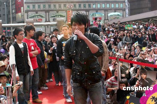 一月六日,臺(tái)灣當(dāng)紅歌星楊宗緯在臺(tái)北車站南二門廣場(chǎng)為他即將出版的新專輯預(yù)購(gòu)造勢(shì)。圖為楊宗緯抵達(dá)現(xiàn)場(chǎng)時(shí)受到歌迷的歡迎。中新社發(fā) 陳立宇 攝