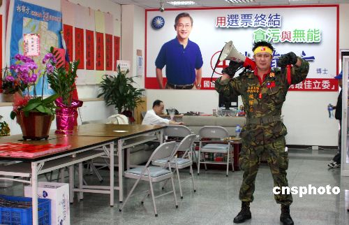 一月十一日,臺灣第七屆“立委”選舉進入最后沖刺階段。圖為在臺北市西園路的一名“立委”候選人競選總部內(nèi),身著戎裝的支持者正準備出發(fā)去掃街拜票。中新社發(fā) 陳立宇 攝