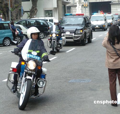 押解歐文龍親屬的囚車(白色)在警察的護衛(wèi)下駛入澳門初級法院。