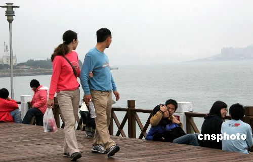 一月二十一日,一對(duì)夫婦從臺(tái)北淡水情人橋上走過,不約而同將視線轉(zhuǎn)向橋邊甜蜜相會(huì)的一對(duì)對(duì)情侶。淡水情人橋位于臺(tái)北淡水河入?诘臐O人碼頭,是觀海、休閑和情侶約會(huì)的好去處。中新社發(fā) 孫自法 攝