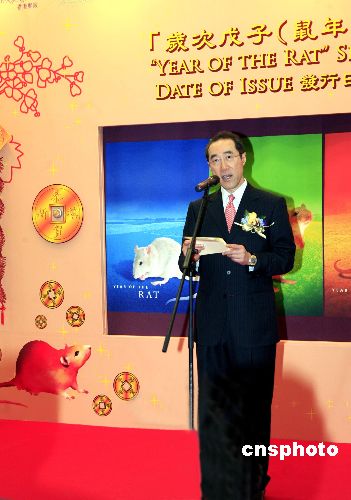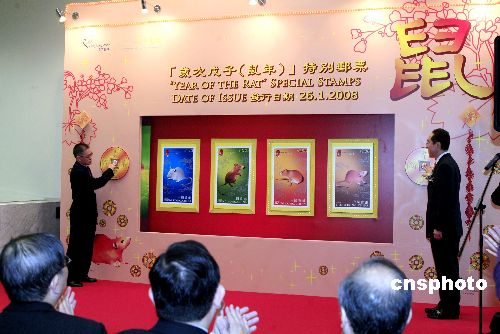 一月二十六日﹐香港郵政舉行農(nóng)歷新年特別郵票“歲次戊子(鼠年)”發(fā)行儀式,特區(qū)政務(wù)司司長唐英年和香港郵政署長譚榮邦主禮。唐英年在儀式上致詞,冀香港人學(xué)習(xí)老鼠聰明伶俐、適應(yīng)力強的特質(zhì),把握機遇,建設(shè)好家園。中新社發(fā) 王麗南 攝