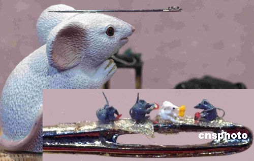 1月27日,臺灣微雕大師陳逢顯展示自己以樹脂為原材料雕塑的當(dāng)今世界最小的老鼠,以迎接鼠年新春。通過高倍放大鏡可欣賞到白鼠頭頂繡花針上的微雕作品——栩栩如生的一白三灰四只小鼠(右下),平均每只僅0.27毫米大小。中新社發(fā) 孫自法 攝