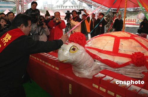 二月十五日,二00八臺北花燈節(jié)開幕,澎湖縣天后宮媽祖受邀前來。按照當(dāng)?shù)刈诮虃鹘y(tǒng),澎湖人員在花燈節(jié)現(xiàn)場造乞龜臺一座,舉行點(diǎn)青官為“元宵乞龜”點(diǎn)青儀式。中新社發(fā) 徐長安 攝