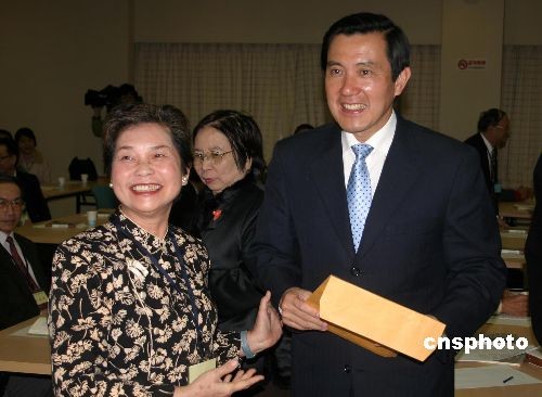中國(guó)國(guó)民黨臺(tái)灣地區(qū)領(lǐng)導(dǎo)人候選人馬英九(中)出席會(huì)議并發(fā)表講話。