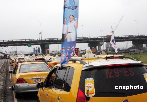 3月10日,一向給外界挺綠印象的臺北全民計程車聯(lián)誼會決定在此次臺灣大選中棄綠轉(zhuǎn)藍(lán),在總會長邱奕枝號召下,陸續(xù)聚集2500輛計程車并成立馬蕭后援會,場面壯觀。圖為在集會現(xiàn)場,許多計程車插上馬蕭競選旗幟,司機(jī)戴上有關(guān)標(biāo)識帽子。中新社發(fā) 黃少華 攝
