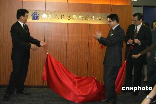 三月十二日,臺灣;鶗麻L洪奇昌(右二)、“陸委會主委”陳明通(右一)、;鶗貢L游盈隆(左一)為海基會兩岸人民急難服務中心揭牌。中新社發(fā) 曾嘉 攝