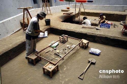 十三行博物館位于臺北縣八里鄉(xiāng)淡水河?诮唤缣幍哪习,面積約為62500平方公尺,在1989至1992年間,因為在遺址上興建八里污水處理廠,引發(fā)附近居民以及學(xué)者抗議。在社會輿論的聲援下,當局一邊開挖古物、一邊興建污水處理廠,最後在廠內(nèi)保留出一塊古跡保護區(qū),并在污水處理廠旁建造十三行博物館,保存出土文物。 1957年地質(zhì)學(xué)者林朝綮在這里發(fā)現(xiàn)史前的煉鐵遺跡,同時亦發(fā)現(xiàn)許多史前陶片、石支腳與凹石等,因而判斷此處為史前遺址,并依據(jù)該地地名將它定名為十三行遺址。十三行人是目前臺灣唯一確定擁有煉鐵技術(shù)的史前居民,可能是臺灣平埔族凱達格蘭人的祖先。十三行文化屬于北臺灣地區(qū)的金屬器時代,時間大致從2300年前開始,到漢人進入本地區(qū)之后才結(jié)束。圖為重現(xiàn)當年考古發(fā)現(xiàn)的場景。中新社發(fā) 杜洋 攝