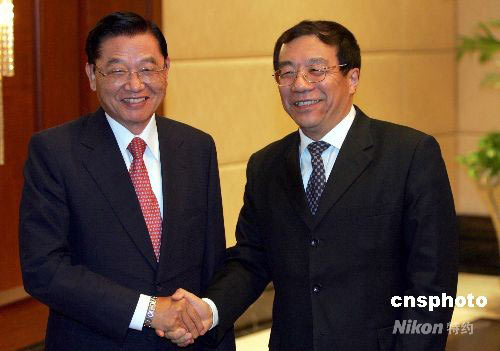 4月25日晚,中共上海市委常委楊曉渡(右)在上海興國賓館會見了中國國民黨副主席江丙坤(左)一行。中新社發(fā) 湯彥俊 攝