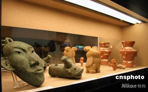 傅斯年等人八十年前奉“中研院”院長(zhǎng)蔡元培之命于廣州創(chuàng)立的“中研院”歷史語言研究所今年慶八十華誕。5月10日,該所舉辦展覽,將商朝馬車、漢代石刻畫像拓本等珍貴文物以數(shù)字化方式呈現(xiàn)于臺(tái)北“臺(tái)灣民主紀(jì)念館”。圖為展覽中陳列了該所發(fā)掘的三千年前西北岡遺址青銅人面(左一)的仿制品等。中新社發(fā) 劉舒凌 攝