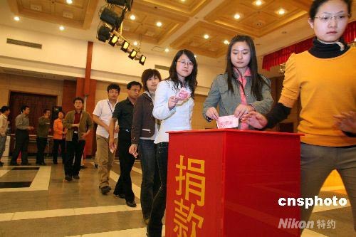 5月13日,國務(wù)院僑辦暨直屬單位在北京舉行為四川地震災(zāi)區(qū)捐款活動(dòng)。5月12日下午,四川省汶川縣發(fā)生7.8級大地震,四川部分地區(qū)受災(zāi)嚴(yán)重,這場災(zāi)難牽動(dòng)著全中國人民的心。中新社發(fā) 張勤 攝