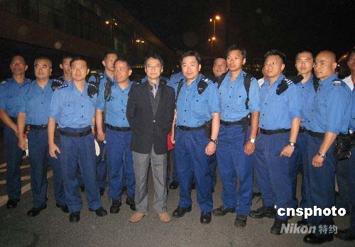 五月十五日凌晨,香港特區(qū)政府派出的二十人搜救隊(duì)伍,抵達(dá)四川地震災(zāi)區(qū)協(xié)助搜救工作。搜救隊(duì)成員包括消防處特別救援隊(duì)十五名消防員及三名救護(hù)員,以及衛(wèi)生署一名醫(yī)生及護(hù)士。圖為香港特別行政區(qū)政府駐成都經(jīng)濟(jì)貿(mào)易辦事處主任陸仿真(中)與搜救隊(duì)員合照。中新社發(fā) 中新社/政府新聞處 攝