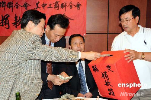 當(dāng)?shù)貢r(shí)間十四日晚,四十一位閩籍華僑在華盛頓中國城發(fā)起四川大地震賑災(zāi)募捐,十分鐘現(xiàn)場(chǎng)捐款就達(dá)二萬一千多美元。圖為美國福建同鄉(xiāng)聯(lián)合會(huì)僑胞積極為四川災(zāi)區(qū)捐款,表達(dá)愛心。中新社發(fā) 邱江波 攝