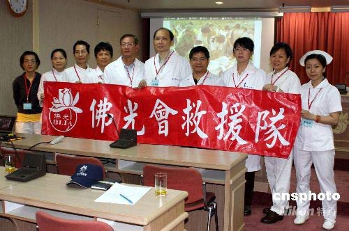 四月十九日下午,臺(tái)灣佛光山國際佛光會(huì)的一支由醫(yī)生和護(hù)士義工組成的十人醫(yī)療救援隊(duì),啟程前往四川協(xié)助救災(zāi)。他們還帶去六百公斤的醫(yī)療器具和藥品。圖為救援隊(duì)行前合影。中新社發(fā) 陳立宇 攝