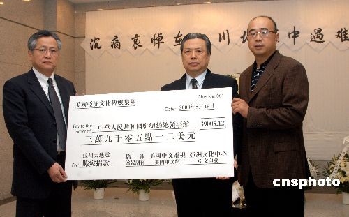 5月20日,美國亞洲文化傳媒集團(tuán)總裁蔣天龍(左)和美國《僑報(bào)》總裁李冰(右)前往中國駐紐約總領(lǐng)事館,代表集團(tuán)董事會及其屬下的《僑報(bào)》、美國中文電視、亞洲文化中心、美國中文網(wǎng)、《僑報(bào)周刊》的全體員工及其家屬,向中國地震災(zāi)區(qū)遇難同胞表示沉痛哀悼,并捐贈(zèng)集團(tuán)同仁募集的款項(xiàng)3萬9千多美元。圖為中國駐紐約總領(lǐng)事彭克玉(中)代表領(lǐng)館接受捐款。中新社發(fā) 鄧悅 攝