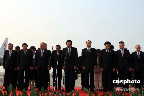5月26日,中國國民黨主席吳伯雄抵達南京,中共中央臺灣工作辦公室主任陳云林到機場迎接。吳伯雄主席將率中國國民黨訪問團于26日至31日在南京、北京、上海訪問。他將此行定位為“工作會談”,一方面要為未來馬英九就任后的兩岸關(guān)系開路,一方面也要前往南京中山陵拜祭。圖為吳伯雄、陳云林等南京祿口機場默哀悼念四川地震遇難者。中新社發(fā) 盛佳鵬 攝