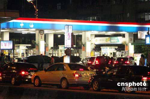 臺灣島內(nèi)二十八日凌晨全面調(diào)升油價,當晚上各加油站排滿汽車長龍。圖為中油公司附近一個加油站場景。中新社發(fā) 陳立宇 攝