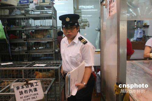 六月七日,香港一名工作人員對銅鑼灣街市一家活雞攤檔進(jìn)行巡查。香港食物及衛(wèi)生局局長周一岳當(dāng)日表示,確定月初在保安道街市抽取的五個雞只樣本,帶有H5N1禽流感病毒,特區(qū)政府對禽流感的應(yīng)變級別將由原來的“戒備”級別,升為“嚴(yán)重”級別。中新社發(fā) 武仲林 攝