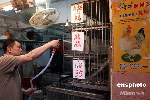 六月九日,香港各街市活雞攤檔提前兩天進(jìn)行休市清潔,預(yù)防禽流感。六月七日,香港保安道街市的五個(gè)雞只樣本,確認(rèn)帶有H5N1禽流感病毒,特區(qū)政府將禽流感的應(yīng)變級別提升為“嚴(yán)重”級別。中新社發(fā) 武仲林 攝