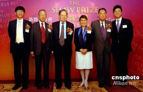 六月十日,二零零八年度“邵逸夫獎(jiǎng)”在香港舉行新聞發(fā)布會(huì),公布今屆得獎(jiǎng)人名單及獲頒獎(jiǎng)項(xiàng),而頒獎(jiǎng)典禮將于九月九日舉行。邵方逸華女士、馬臨教授(右二)、楊綱凱教授、譚尚渭教授及楊振寧教授(左一起)等“邵逸夫獎(jiǎng)”理事會(huì)成員與擔(dān)任司儀的陳志云(右一)在新聞發(fā)布會(huì)后合照。中新社發(fā) 鄧慶樂 攝