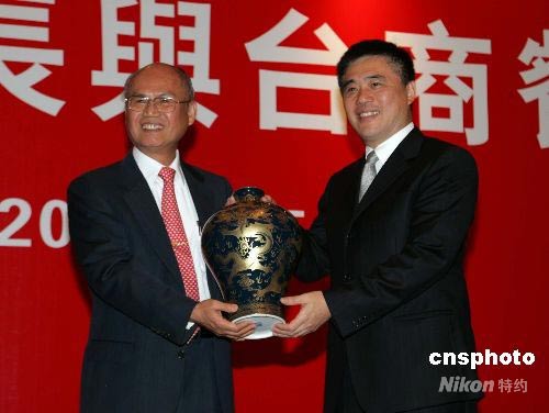6月25日晚,臺北市長郝龍斌在上海與臺商餐敘時,贊賞臺商不僅在家鄉(xiāng)有愛心,在大陸也一樣有愛心,特別是此次四川地震發(fā)生后,臺商踴躍賑災(zāi)精神可嘉。圖為郝龍斌與上海臺商協(xié)會會長李茂盛互贈禮品。