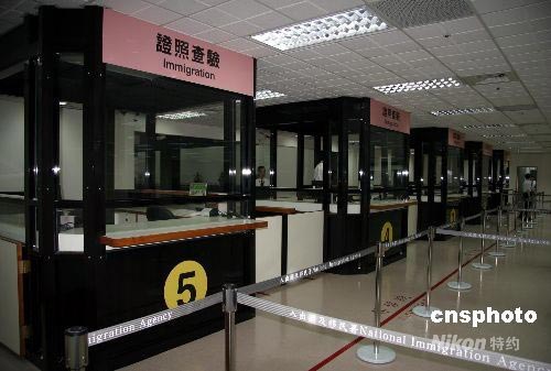 兩岸周末包機將于七月四日啟程,臺北松山機場當(dāng)日到港四班。為因應(yīng)周末包機需要,松山機場在二十多天時間內(nèi),基本完成了機場整修。圖為裝修一新的證照查驗通道。中新社發(fā) 徐長安 攝