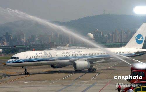 七月四日八時(shí)三十八分,兩岸周末包機(jī)大陸福建首發(fā)團(tuán)乘坐廈門(mén)航空公司B757客機(jī)抵達(dá)臺(tái)北松山機(jī)場(chǎng)。松山機(jī)場(chǎng)以噴水儀式為首發(fā)團(tuán)接風(fēng)洗塵。中新社發(fā) 徐長(zhǎng)安 攝