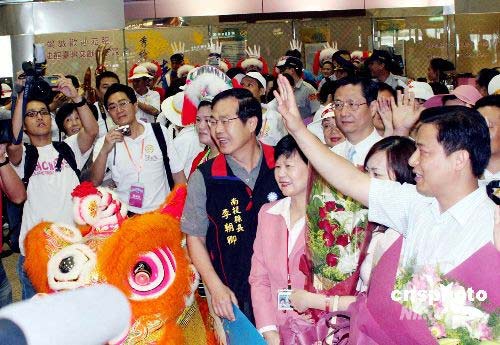 7月4日上午8時(shí)許,中國(guó)南方航空公司CZ3097班機(jī)抵達(dá)臺(tái)北桃園機(jī)場(chǎng)。這是兩岸周末包機(jī)啟動(dòng)后,抵達(dá)臺(tái)灣的首班大陸包機(jī),飛機(jī)搭載了同日施行的大陸居民赴臺(tái)旅游廣東首發(fā)團(tuán)一百多位游客。圖為大陸游客在桃園機(jī)場(chǎng)受到熱烈歡迎。中新社發(fā) 黃少華 攝