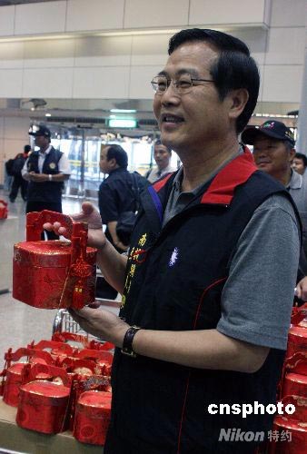 7月4日,大陸居民赴臺(tái)旅游及兩岸周末包機(jī)同時(shí)啟動(dòng)。時(shí)隔59年后,兩岸間首次有600多位大陸游客循正常渠道于當(dāng)日到臺(tái)灣旅游,實(shí)現(xiàn)了兩岸民眾的雙向旅游。陸客抵臺(tái),臺(tái)灣臺(tái)北縣、桃園縣和南投縣等多個(gè)縣市爭先歡迎。南投縣長李朝卿親自在桃園機(jī)場(chǎng)入境口向大陸游客致贈(zèng)紀(jì)念品。中新社發(fā) 黃少華 攝