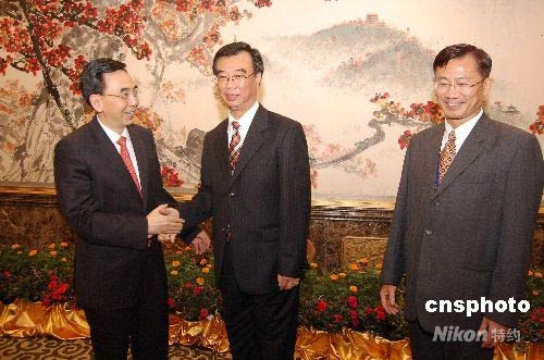中國國民黨高雄市委員會廣州訪問團一行,七月十二日搭乘高雄至廣州周末包機抵穗。中共廣州市委書記朱小丹(左一),在廣州東方賓館會見該訪問團全體成員。中新社發(fā) 柯小軍 攝